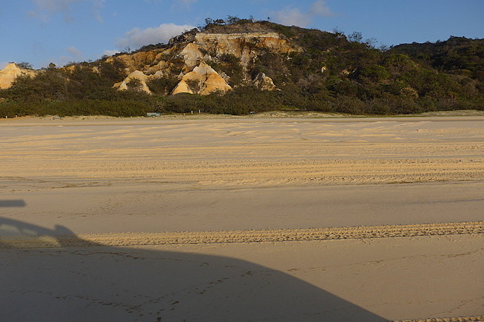 The Pinnacles Coloured Sands - learn how 72 colours of sand formed and the Butchulla legends surrounding them. We stop to take a picture as we drive along 75 Mile Beach.